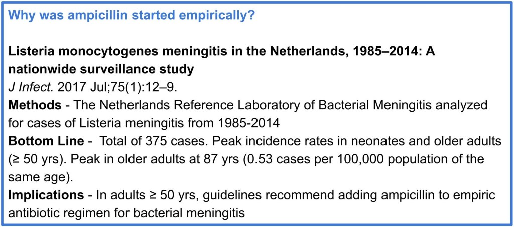 | 3. Bacterial meningitis – Coxiella burnetti serology pending | – Meningismus – Acute illness progression – Could involve lungs – Improvement could be delayed response to previous antibiotics | – No bacteria identified yet – Would not explain eosinophilia |