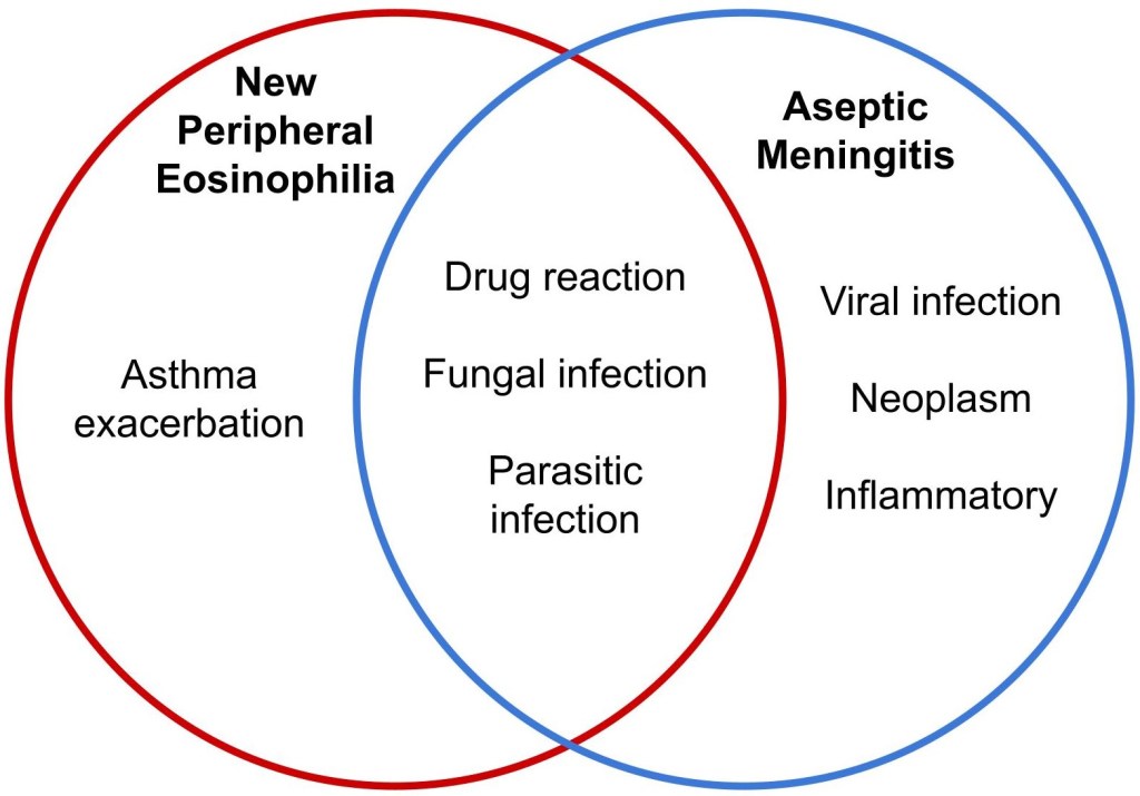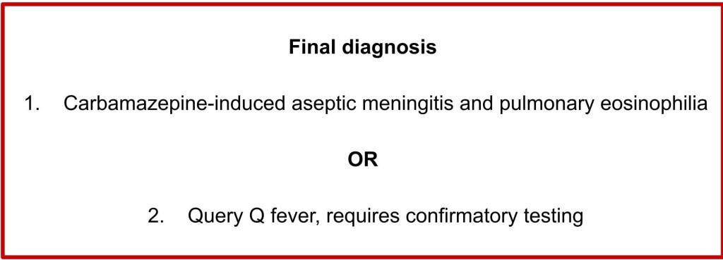 | 1. Drug reaction – Most likely Carbamazepine | – Abnormal CSF – In last month, cephalexin, carbamazepine, pregabalin started – Could involve lungs – Could cause drug rash – Could cause eosinophilia – Rapid improvement following stopping Carbamazepine | |