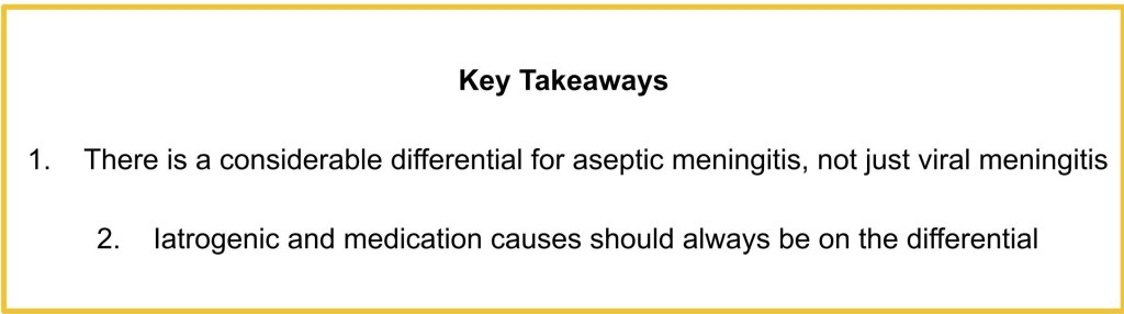 | 5. Drug-induced meningitis | – Abnormal CSF – In last month, cephalexin, carbamazepine, pregabalin started – Could involve lungs – Could cause drug rash | – Diagnosis of exclusion, need to rule out other causes |