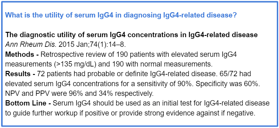 Discussion #3 @29:32 – Differential for elevated IgG4 beyond IgG4-related disease1,2